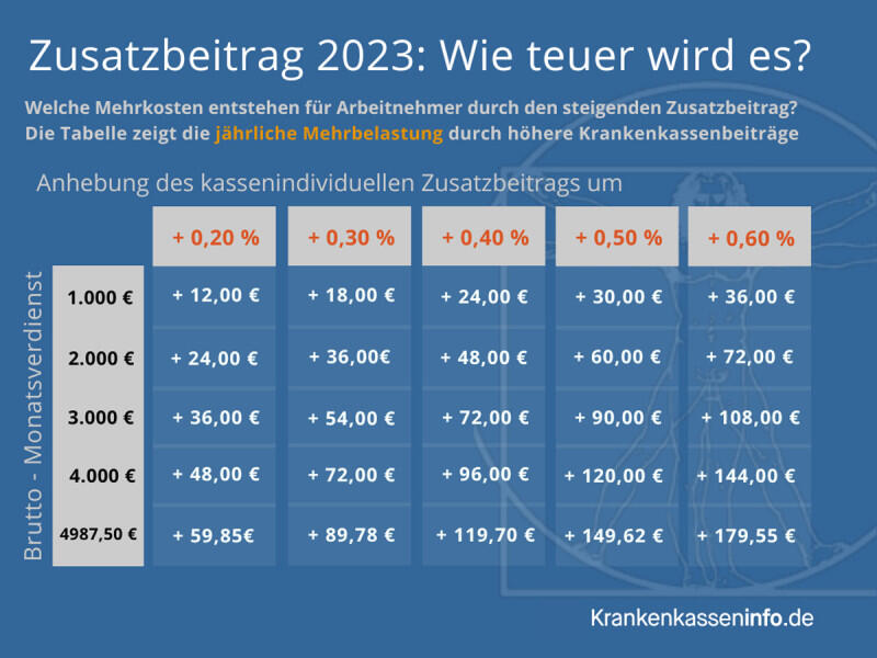 Mehrbelastung durch höheren Zusatzbeitrag 2023 - Beispielrechungen(c) Krankenkasseninfo.de