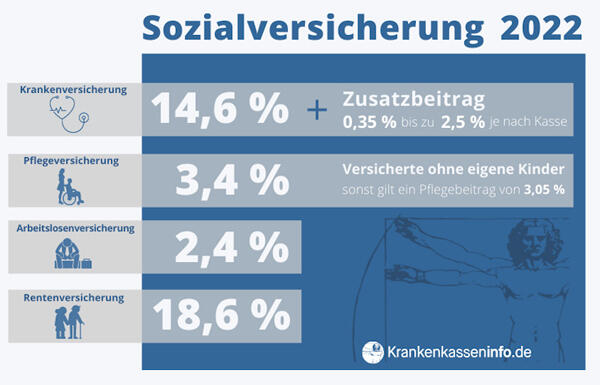 So betrug die Summe der Sozialbeiträge für Kinderlose ohne Berücksichtigung des Zusatzbeitrags zu Beginn des Jahr 2022 bereits 39,2 %. Rechnete man dann den für das Kalenderjahr geltenden durchschnittlichen Zusatzbeitrag von 1,3 Prozent hinzu, betrug die Summe bereits 40,5 %. Im Jahr 2023 erhöhten sich durch die Pflegereform und gestiegene Zusatzbeiträge wiederum die Sozialabgaben.